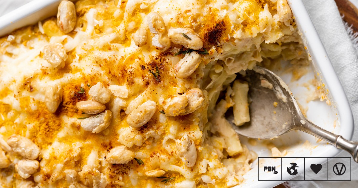 Finally, make Romy London’s vegan mac and beans. Cannellini beans and potato blend into a smooth sauce flavored with miso and nutritional yeast, coating tender macaroni. Baking adds a crisp topping, while pan-fried beans provide contrast against the creamy interior.
