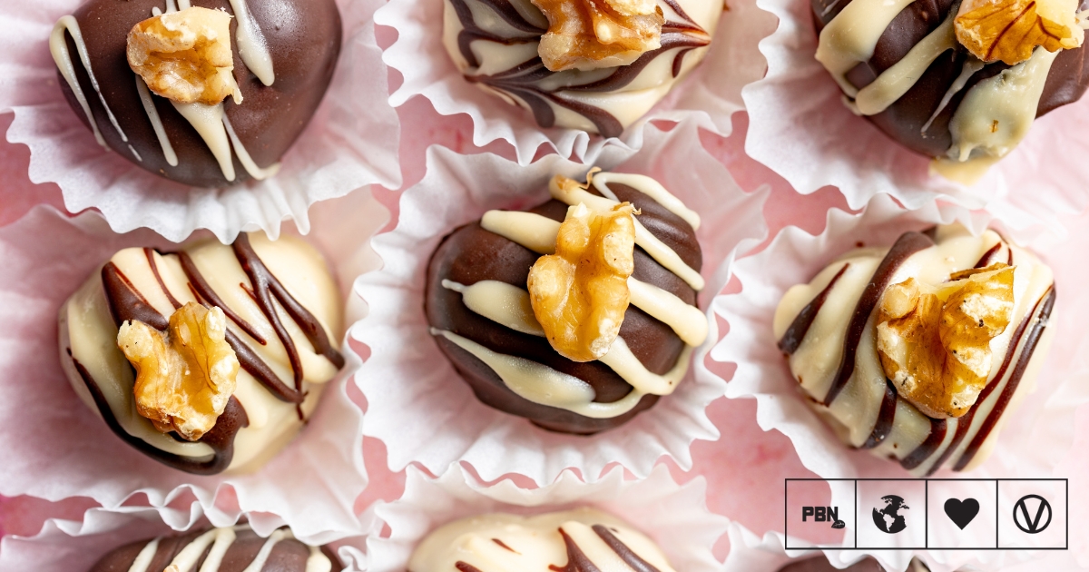 The last recipe on this list is for these vegan heart-shaped chocolate truffles by Romy London. Dark chocolate combines with crunchy bran sticks and walnuts for texture, then gets coated in a smooth chocolate shell. Molded shapes and nut topping give them a polished, gift-ready finish.
