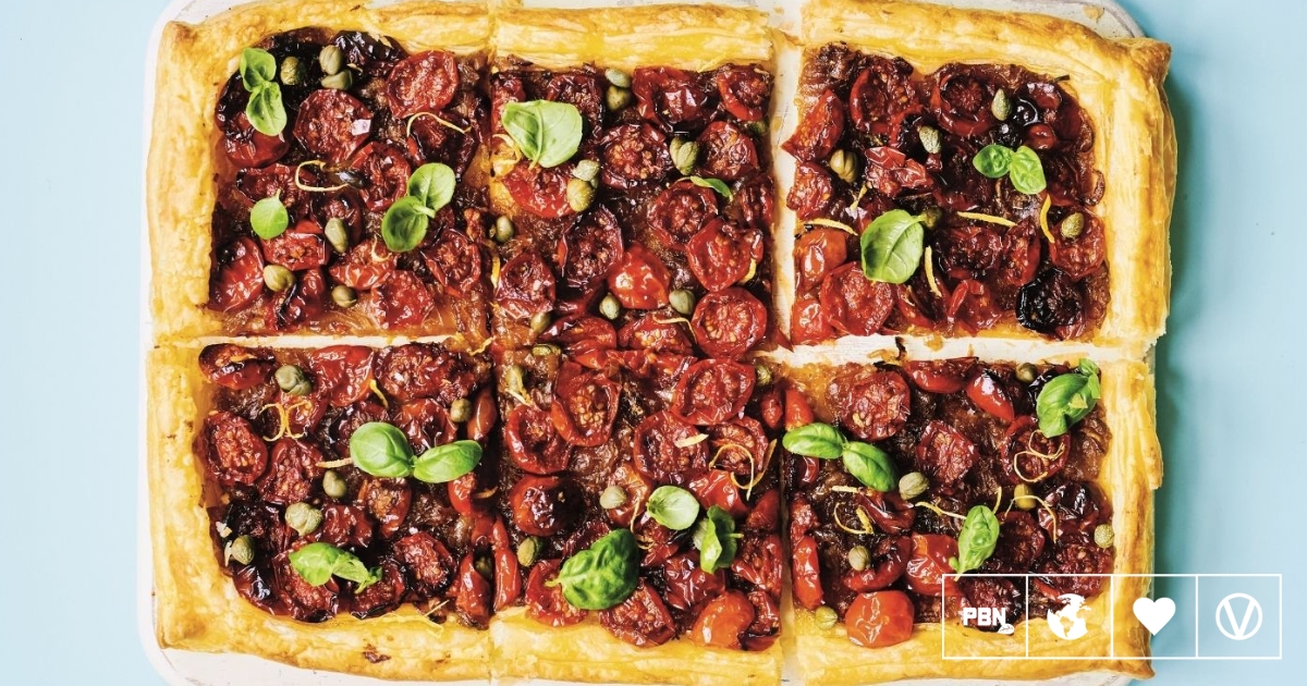 Last up is this caramelized shallot and tomato tart by Saskia Sidey. Sticky shallots and confit tomatoes sit on crisp vegan puff pastry. Capers, lemon zest, and basil cut through the richness. Each slice leans into both sweet and savory flavors, making this tart work equally well for lunch or sharing.