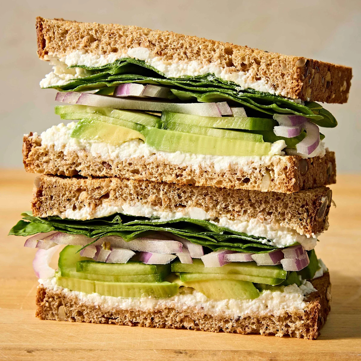 This creamy, crunchy sandwich layers salty feta, crisp cucumber and silky avocado between slices of whole-wheat toast. A simple yogurt-feta spread adds richness and tang, while spinach and red onion bring freshness and bite, perfect for a quick lunch.
