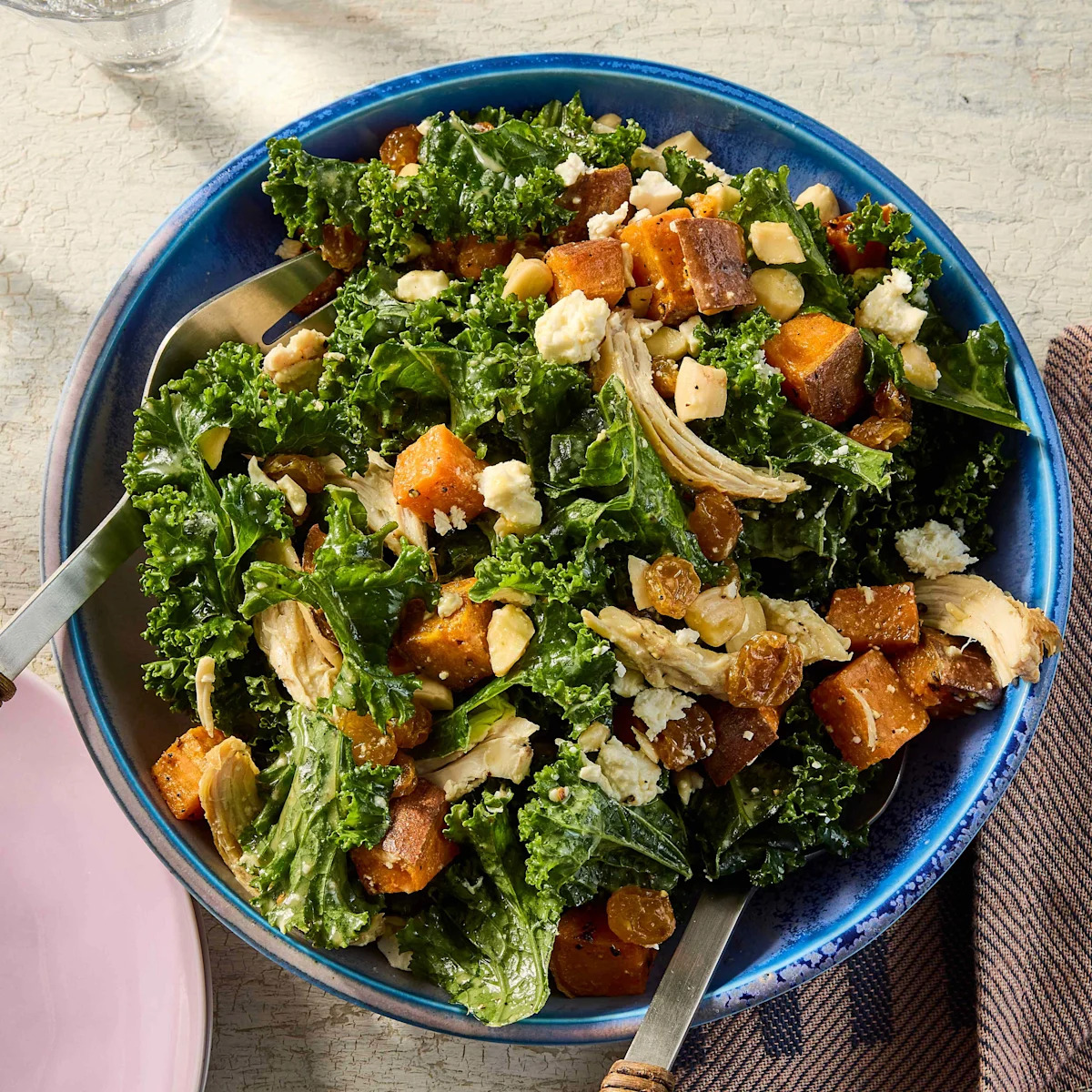 Roasted sweet potatoes, massaged kale and a creamy tahini dressing set the stage for a mix of feta, golden raisins and crunchy almonds.