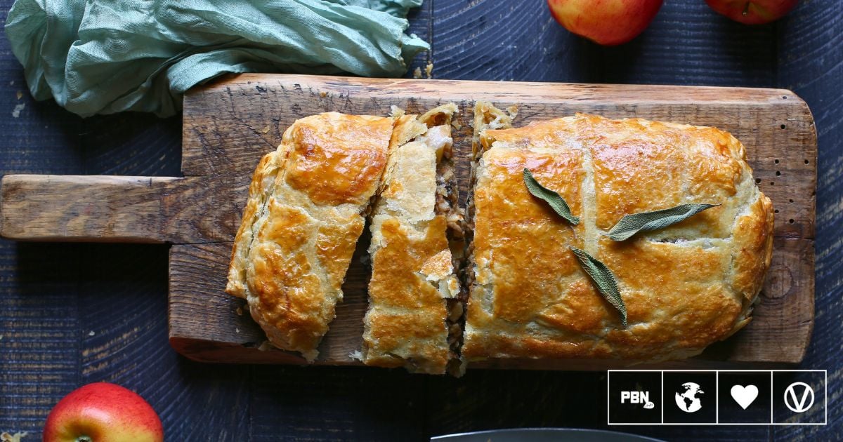 This apple, parsnip, and mushroom wellington brings a festive twist to a classic plant-based centerpiece. It pairs sweet apple with earthy roasted vegetables and mushrooms, making each slice flavorful.