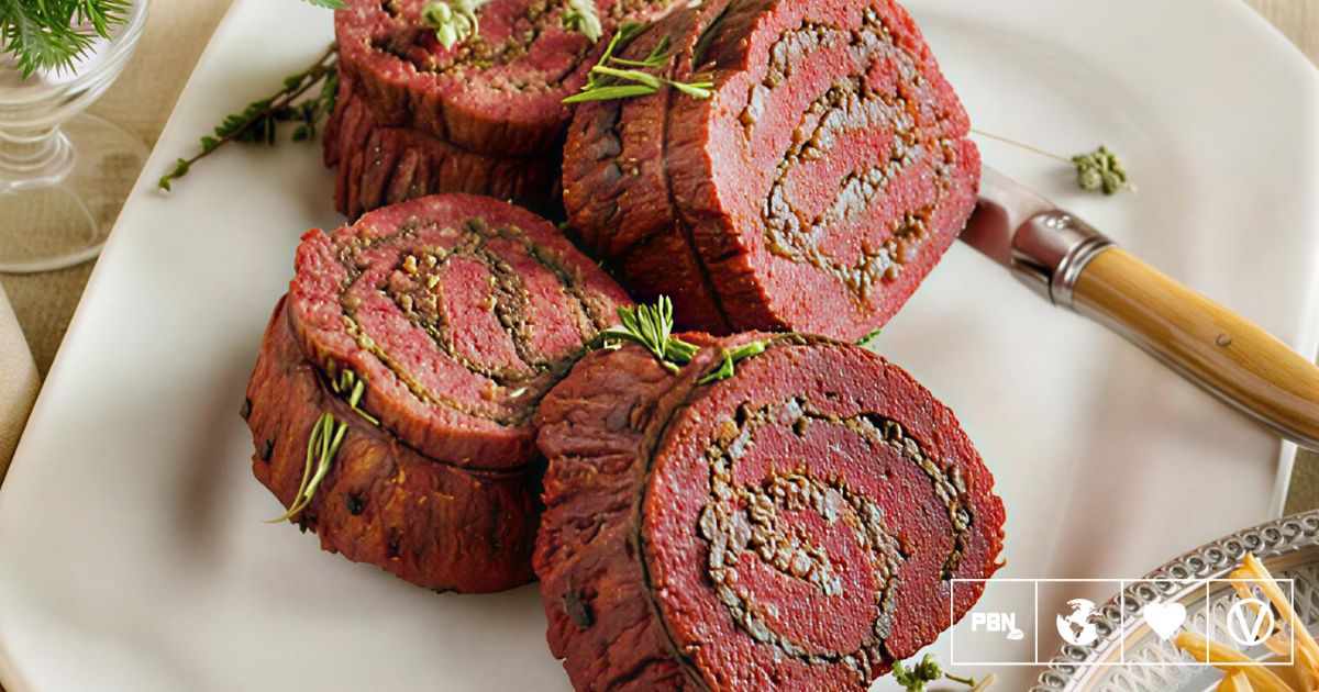 This stuffed flank steak with mushrooms and mulled wine shallots offers a bold vegan centerpiece for the festive table. It has a rich, savory profile that feels different from the usual wellingtons and nut roasts seen during the holidays. The plant-based flank is high in protein and holds its shape well, which makes it ideal for a carved, shareable main.