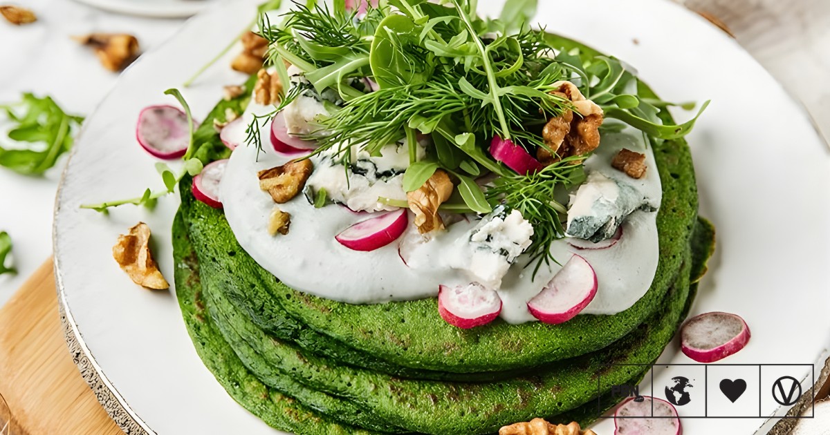 The batter blends spinach, basil, garlic, and flour into soft green pancakes with a mild, herby flavor. A cream made from plain soya yogurt and an organic blue cheese alternative adds tang and richness without dairy. Radish, rocket, and crushed walnuts on top bring crunch, peppery notes, and contrast to the creamy topping.